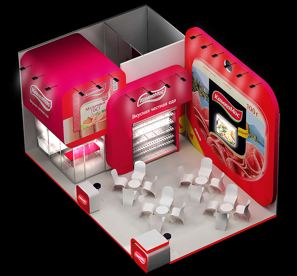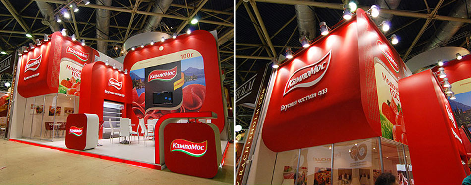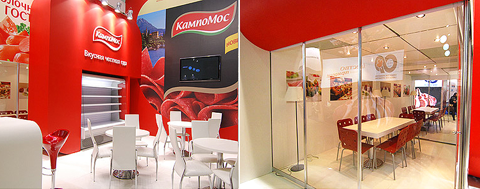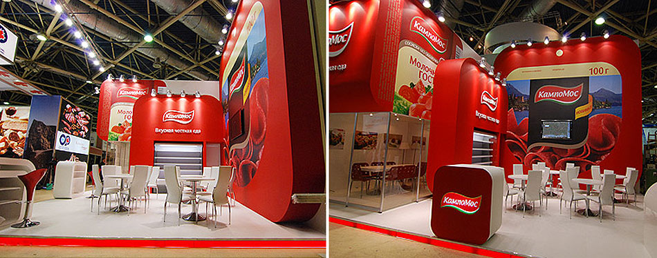 ДизайнГруппаТЕРЕМ совместно с ЭкспоТЕРЕМ построила стенд компании Атрия Россия (бренд Кампомос) на выставке Продэкспо-2013. Дизайнер П.Палей. По желанию Клиента основной акцент в оформлении был сделан на инновационную упаковку Компании. Материалы исполнения ЛДСП, МДФ, окраска.