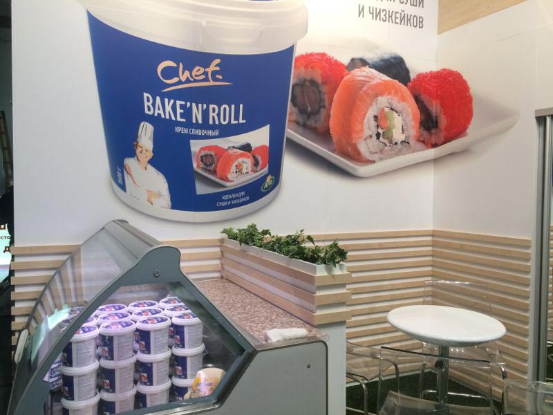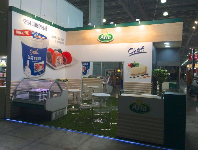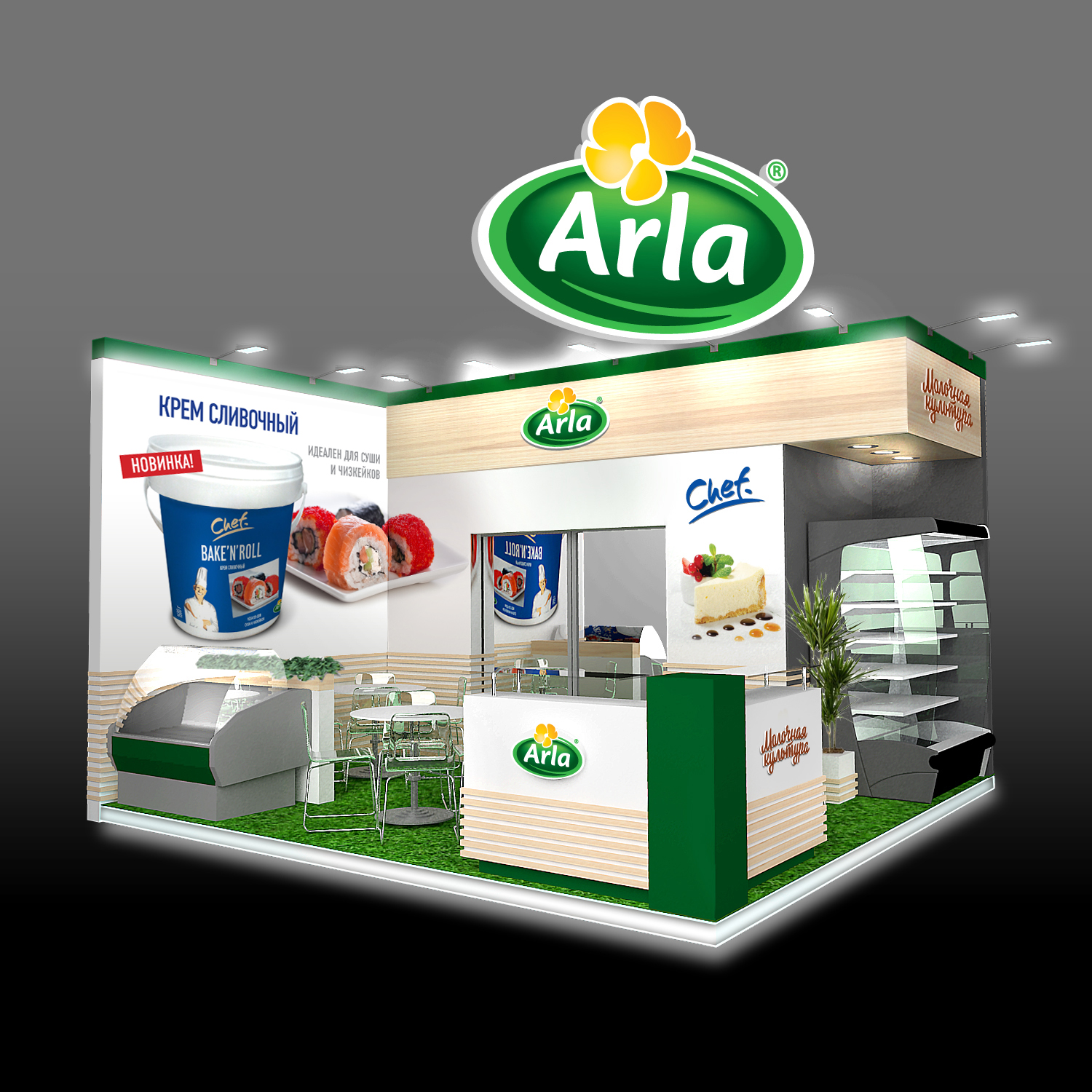 Небольшой выставочный стенд компании "Арла Фудс". Площадь стенда 25 м/кв. Высота стенда 3500 мм. Задачей стенда была реклама нового продукта компании CHEF Bake-n-Roll. На стенде проходили мастер-классы с участием Сергея Малаховского. Дизайнер Павел Палей.