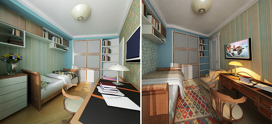 Изначально квартира была двухкомнатной, но после перепланировки была переоборудована в трехкомнатную квартиру. Системы перегородок с кассетными дверьми помогли увеличить полезную площадь помещений.
