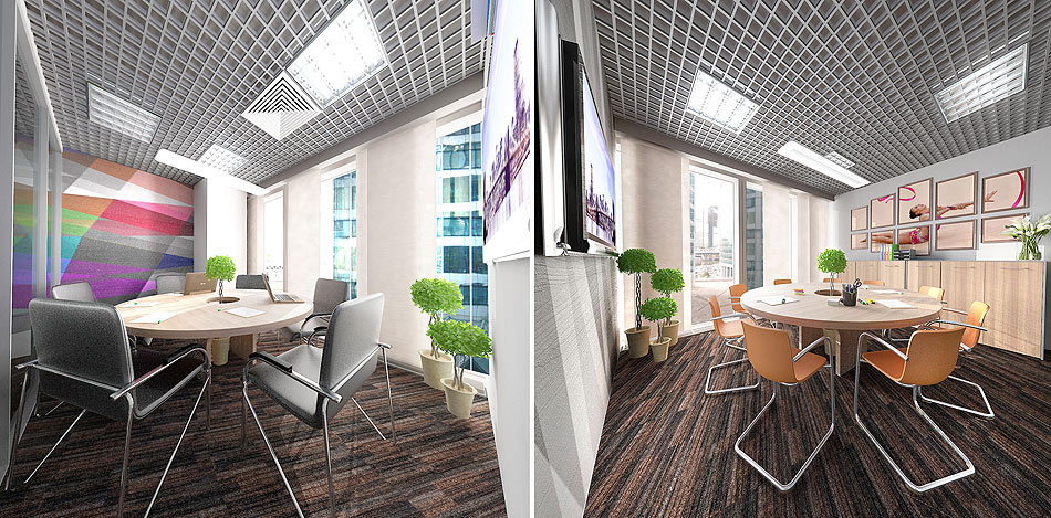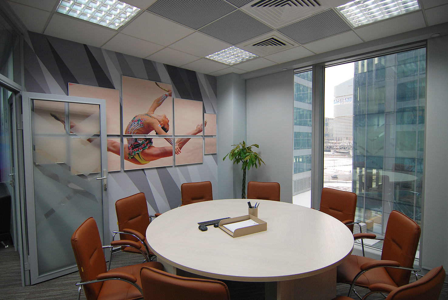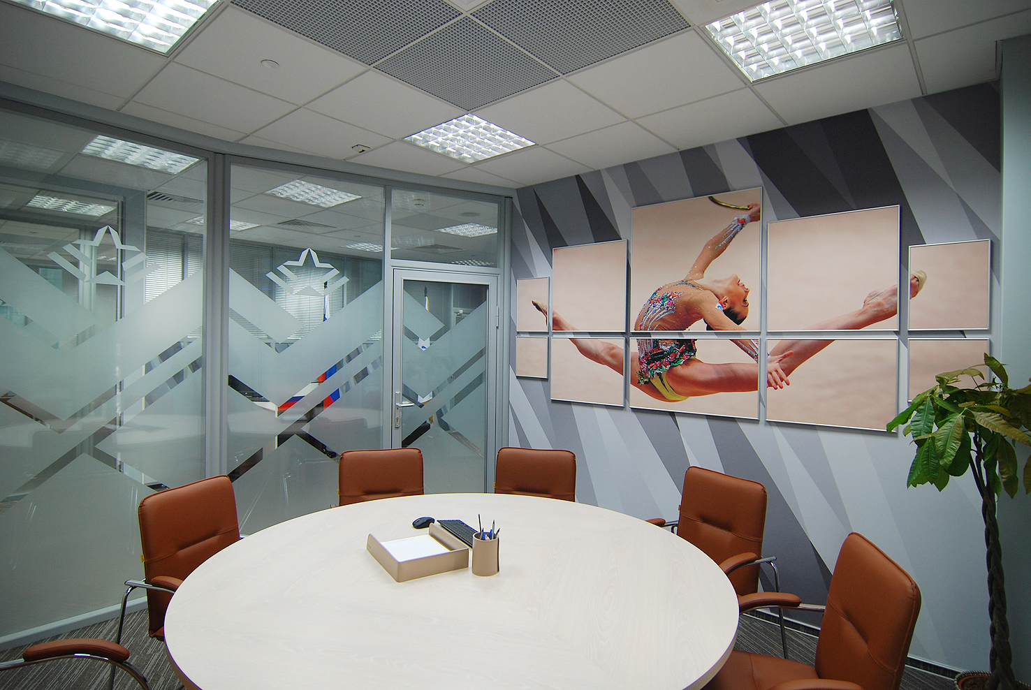 типовых поверхностей офисного пространства узнаваемыми элементами фирменного стиля.
