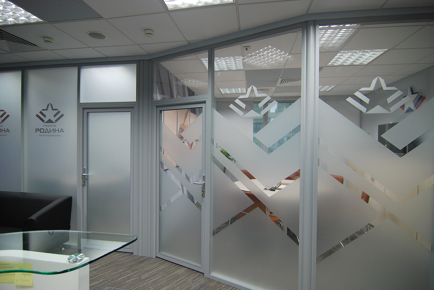 декорирования перегородок - частичное матирование стекла с элементами фирменной