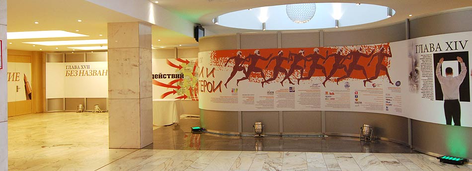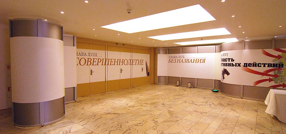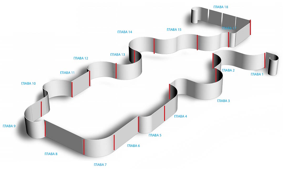 Конструкция “Лента времени” – непрерывная изогнутая стена, длина 120 м/п, высота 2500 мм (белая часть 1500 мм). Серая или серебристая полоса по низу призвана отделить объект от пола, сделать его более легким (кроме того на ее фоне световые приборы не будут смотреться навязчиво) . На схеме указано деление на 18 смысловых частей. Первая часть начинается от входа в фойе, где лента образует завиток бумаги, затем с помощью аниматоров начинают последовательно открываться следующие главы, приводя зрителей в банкетный зал на 3 дверях которого (двери тоже белого цвета) нанесены крупные латинские цифры XVIII (X-V-III). Действие логично завершается на 18 главе, которая вместе с дверями в банкетный зал откроется перед участниками церемонии.