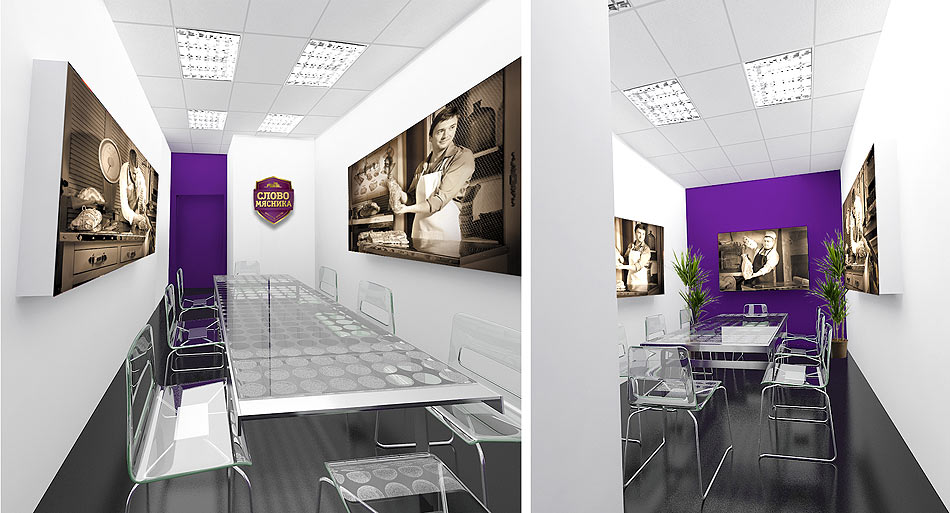 Продукция под брендом «Слово мясника» была представлена в рамках выставки «Продэкспо 2016» и появится в магазинах в уже этой весной. Под маркой будут выпускаться все основные категории охлажденного мяса — рубленые, мелкокусковые, крупнокусковые, порционные и шашлычно-маринадная группа. При создании стенда стояла нестандартная задача расположить в качестве экспоната настоящую свиную тушу. Для этого потребовалось создание холодильной витрины по индивидуальному проекту. Привлекательным элементом в оформлении стали муляжи готовой продукции, расположенные на с двух сторон на опорной угловой стойке. Материалы исполнения: МДФ, Октанорм, окраска, ЛДСП. Напольное покрытие - черный глянцевый поликарбонат. Дизайнер П. Палей.