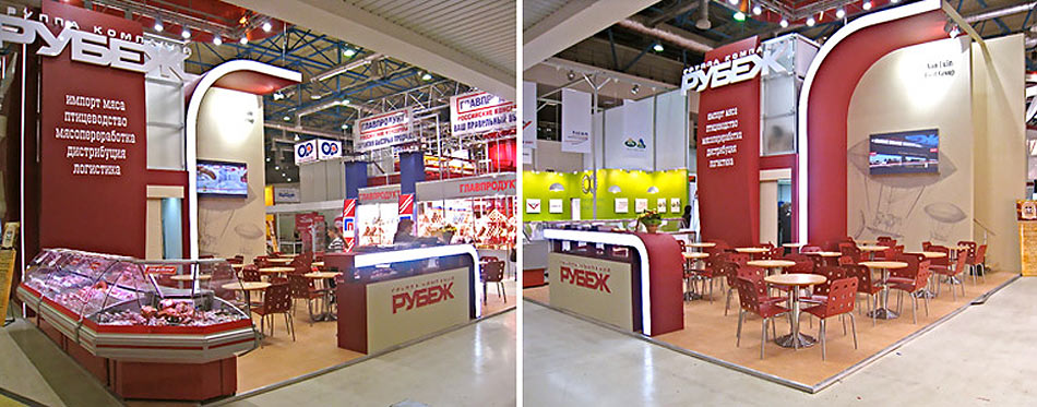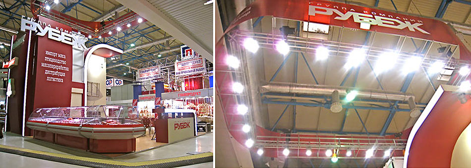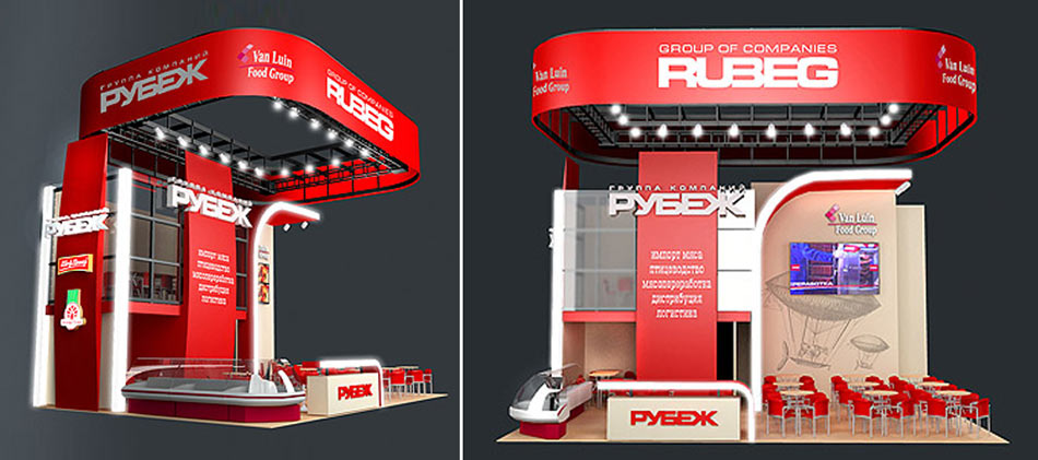 Выставочный стенд ГК "Рубеж". Площадью 72 м/кв. Высота доминанты 6000 мм. Переговорная расположена на 2 этаже. Материалы исполнения: МДФ, окраска, Максима, Октанорм. Дизайнер П. Палей
