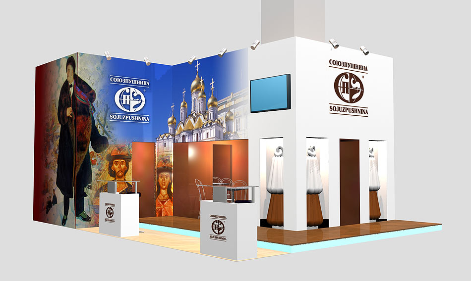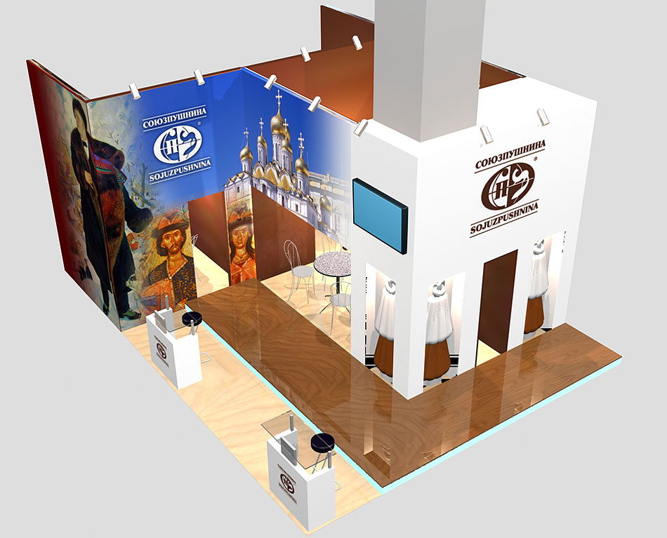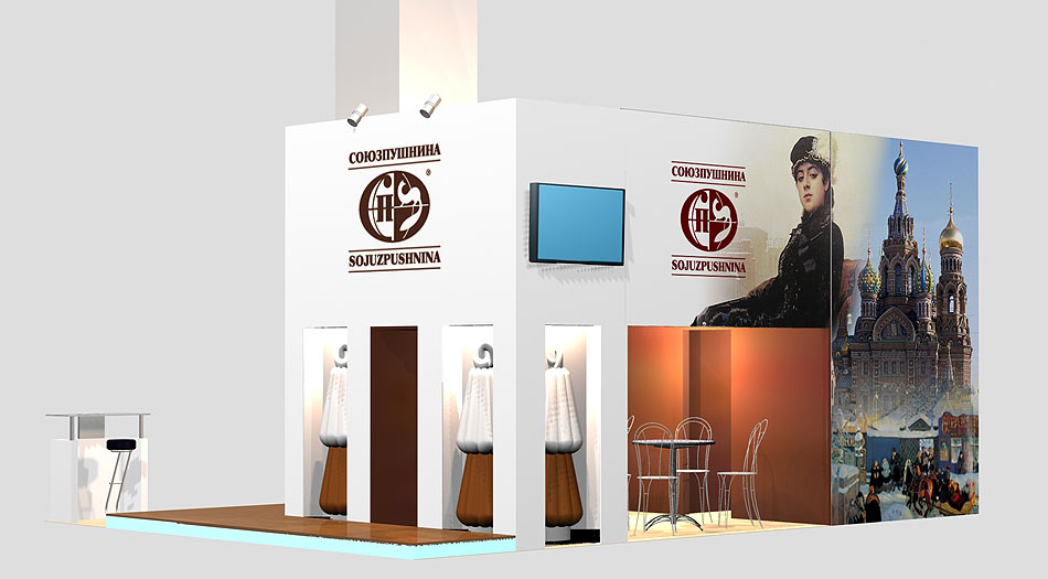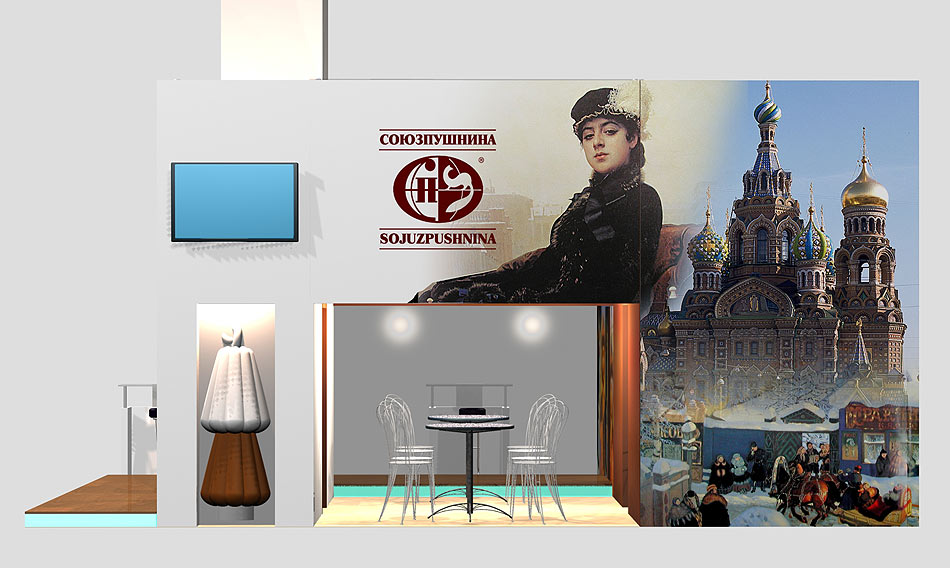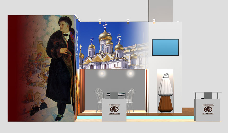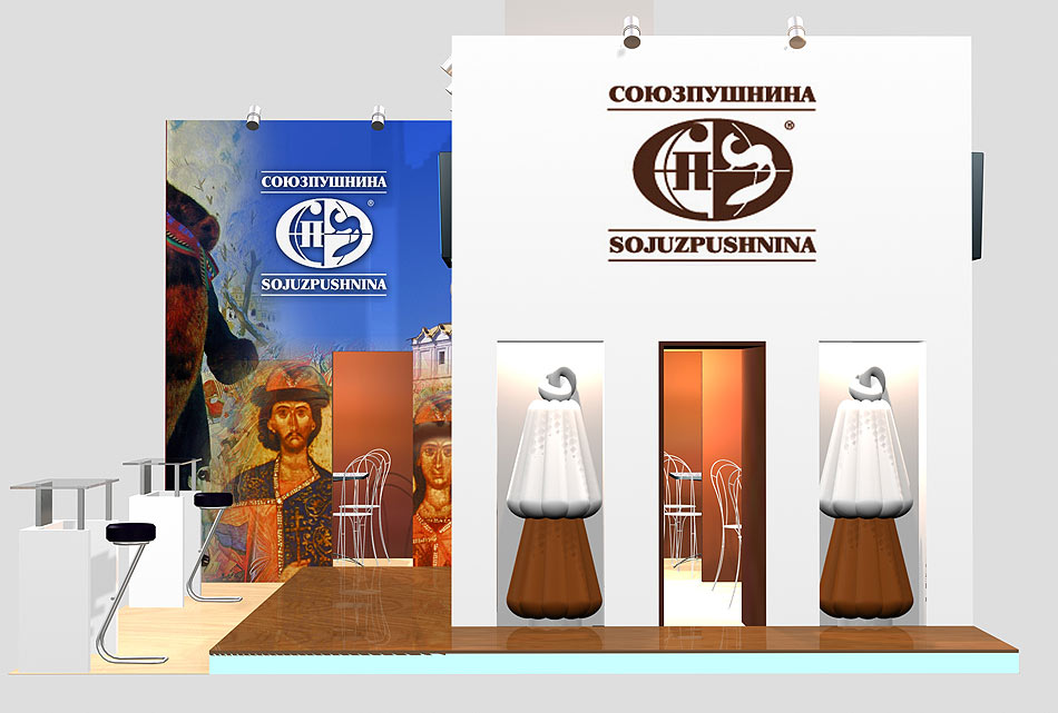 Выставочный стенд компании "Союзпушнина" в Китае. Размер стенда 8х10м, нестандартный конструктор, полноцветное нанесение, высота доминанты 4,4 м. Дизайнер П.Палей.