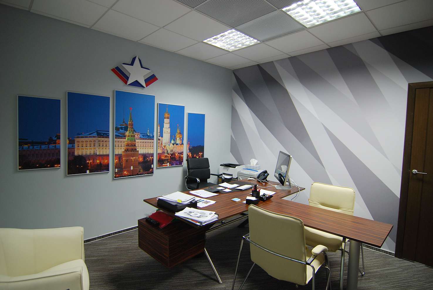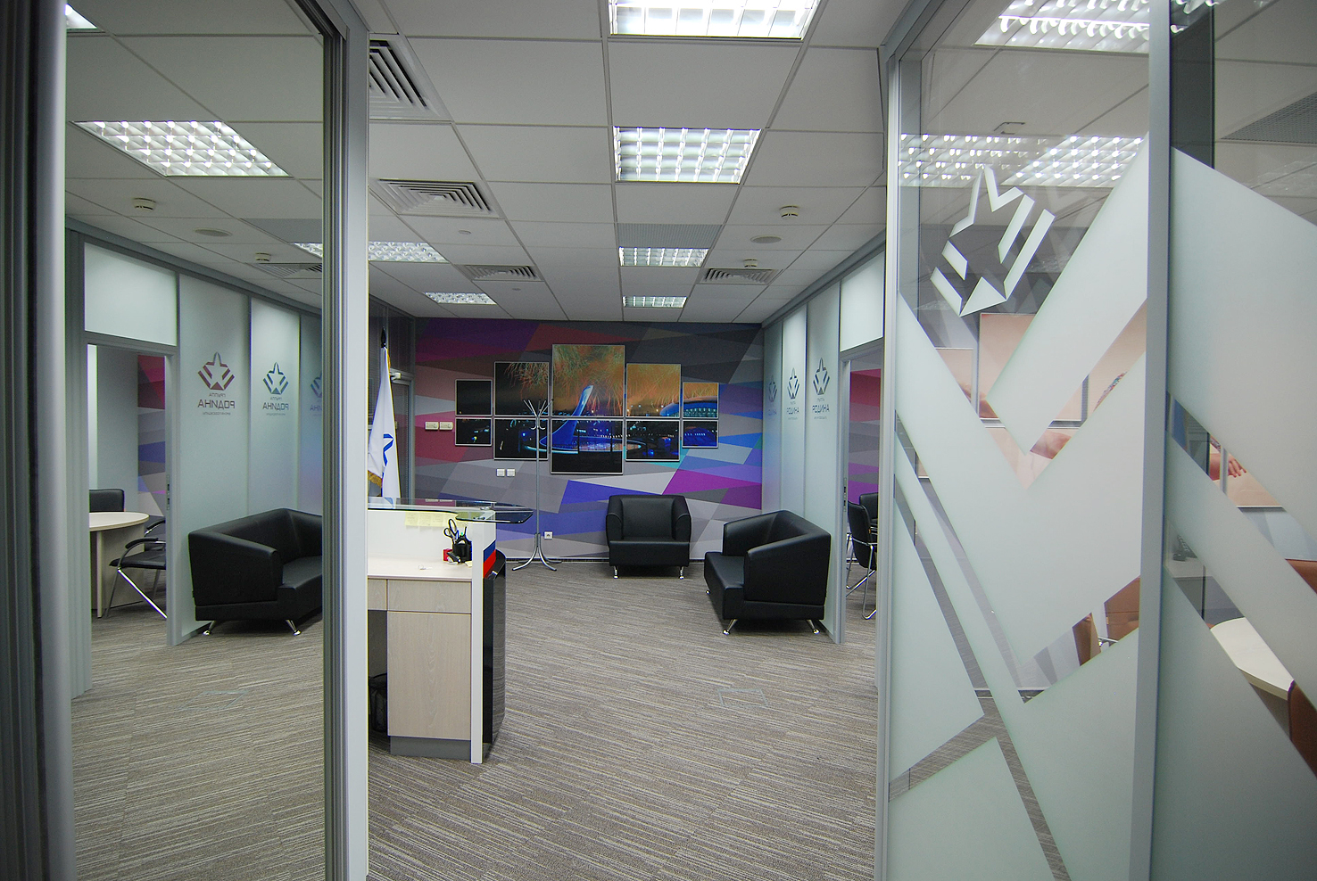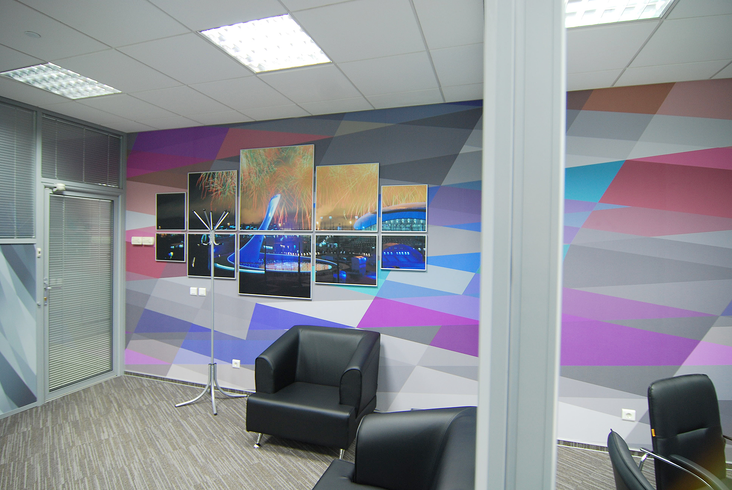 типовых поверхностей офисного пространства узнаваемыми элементами фирменного стиля.