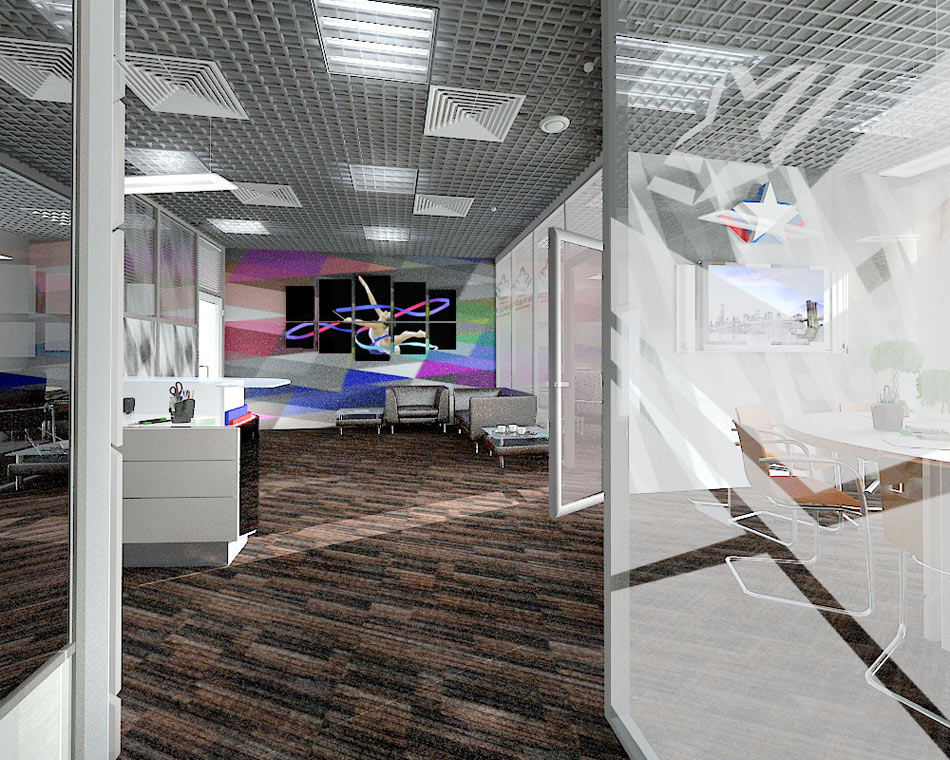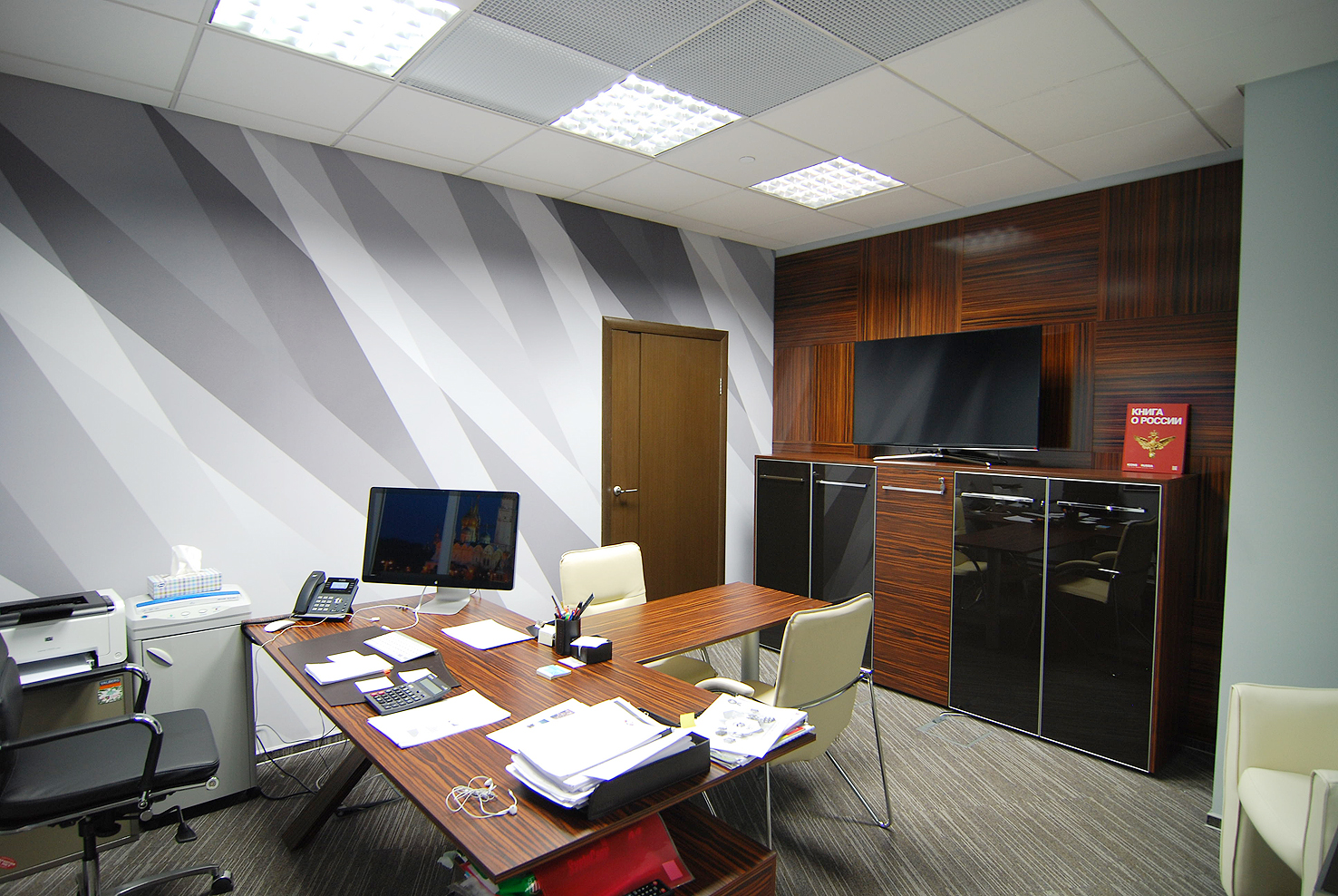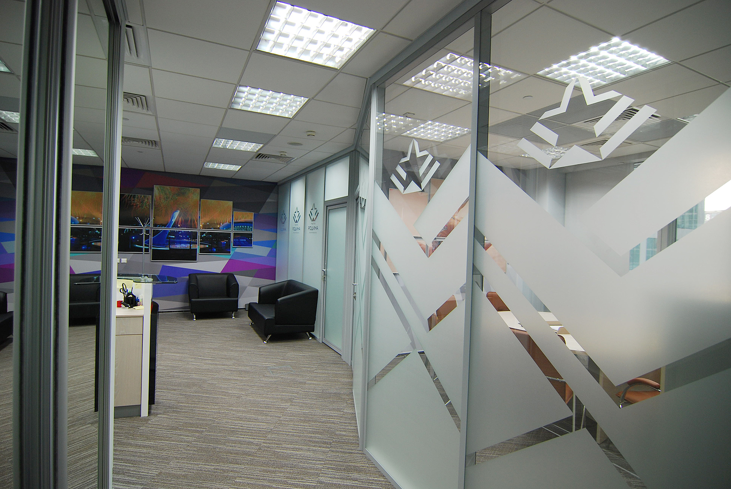 типовых поверхностей офисного пространства узнаваемыми элементами фирменного стиля.