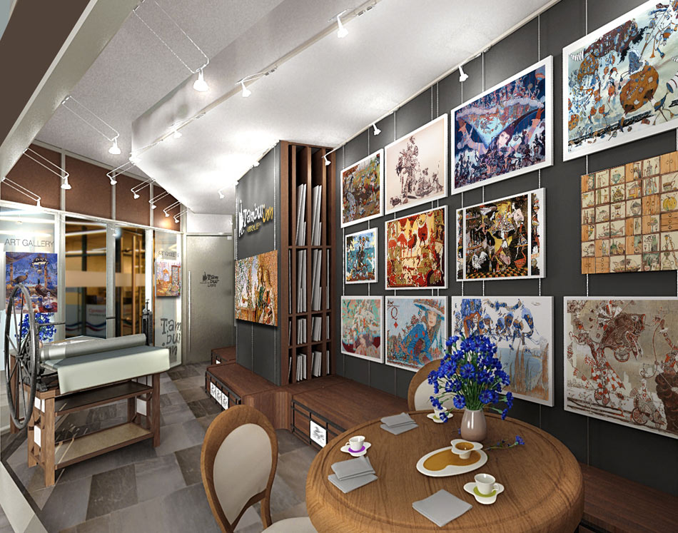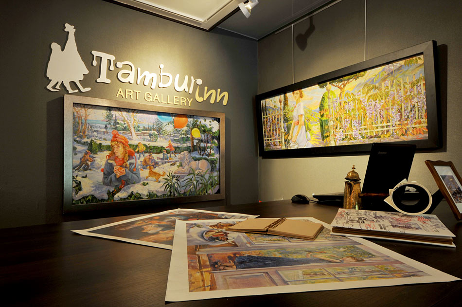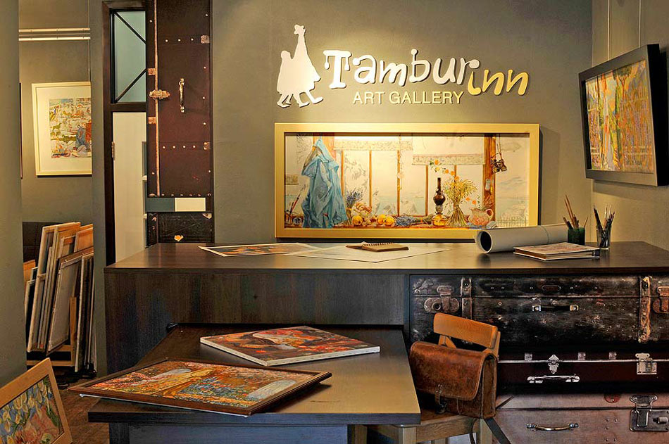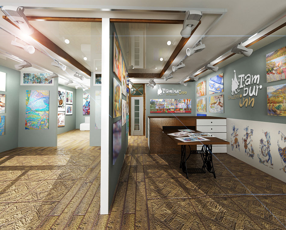 Для замечательных художников Петра Фролова и Натальи Тур были разработаны интерьеры авторских галерей Tamburinn. Первая галерея, которая была открыта в Москве, находилась на небольшом пространстве, перед входом в огромный деловой центр «Знаменка». Были придуманы три названия галереи: «Арт-привратницкая», «Арт-прихожая» и «Tamburinn». «Таmburinn» понравился больше других названий. Inn в переводе с английского - гостиница, постоялый двор… Ассоциативно – что-то уютное и теплое. Вот и получается, что эта галерея - уютный и теплый тамбур перед входом в Мир Искусства. Вслед за ней открылись галереи в Перми на улице Горького д.21 и Новокузнецке. Оформление галереи просходило при непосредственном участии четы художников-основателей Галереи. Задаче разработчиков было создать уютное узнаваемое пространство, учитывая особенности художественной манеры Петра и Натальи. Намеренно застаренный пол, нейтральные темно-серые стены, фасады мебели в виде чемоданов создают неповторимую и привлекательную атмосферу Тамбуринна. Подробнее о галерее и творчестве художников можно узнать на сайте www.ftart.com